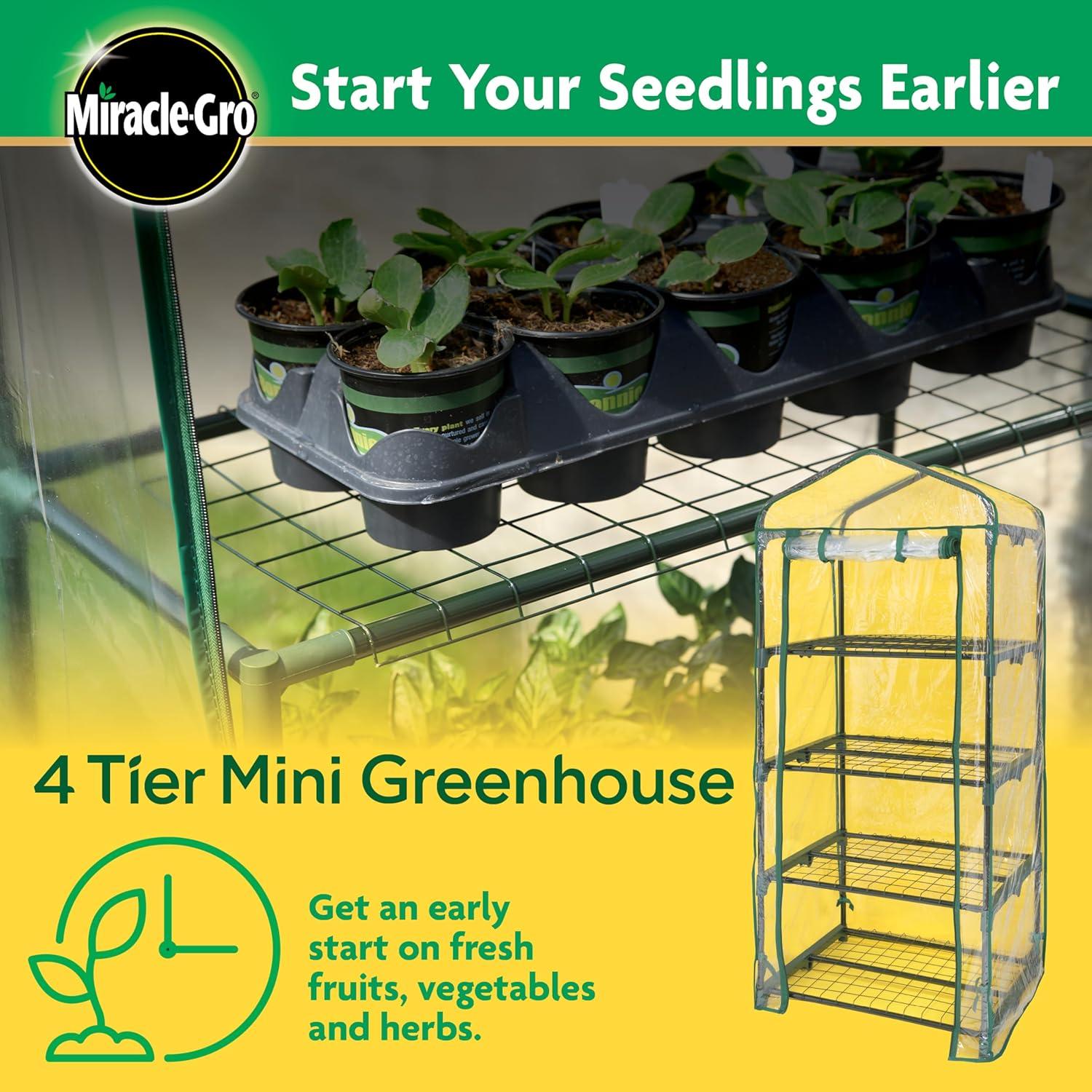 Grow healthy plants year-round in small spaces with the Miracle-Gro 4-Tier Mini Grow House. This compact outdoor and indoor greenhouse is perfect for seed starting, plant propagation, or extending your growing season on decks, patios, balconies, or even inside your home. Built from high-grade 5/8″ tubular steel with a rust-resistant powder coat finish, the sturdy frame offers long-lasting durability in all climates. The heavy-duty 4.4 oz. PVC cover helps maintain warmth and humidity while reducing harmful UV exposure to protect tender seedlings and promote healthy plant growth. Its clear waterproof material allows ample sunlight while shielding plants from pests and wind. A roll-up double zipper door provides easy access to your plants, and four customizable mesh wire shelves let you grow taller plants with ease. Tool-free snap-together design means quick assembly in just 15 minutes. Whether you're an experienced gardener or a beginner looking for a portable greenhouse solution, this tiered grow house offers efficient vertical gardening in a durable, weather-ready package.