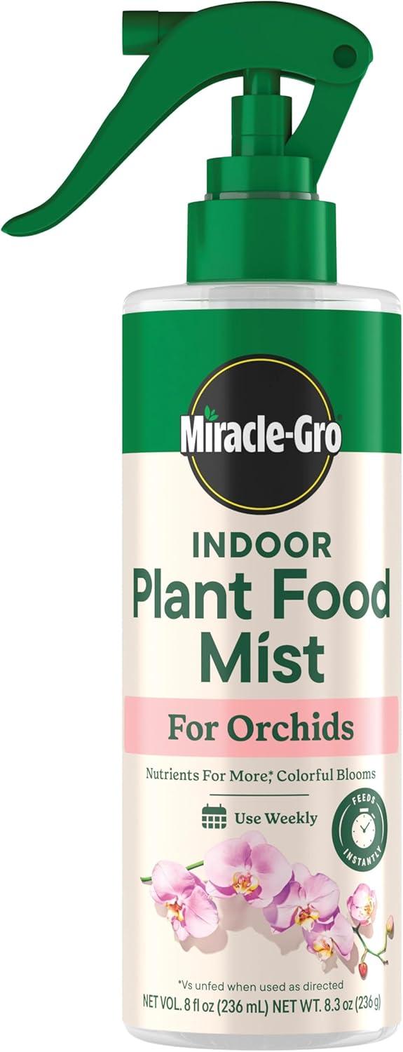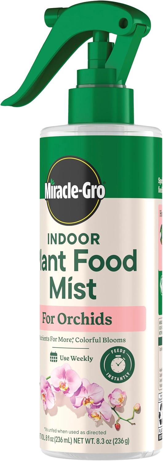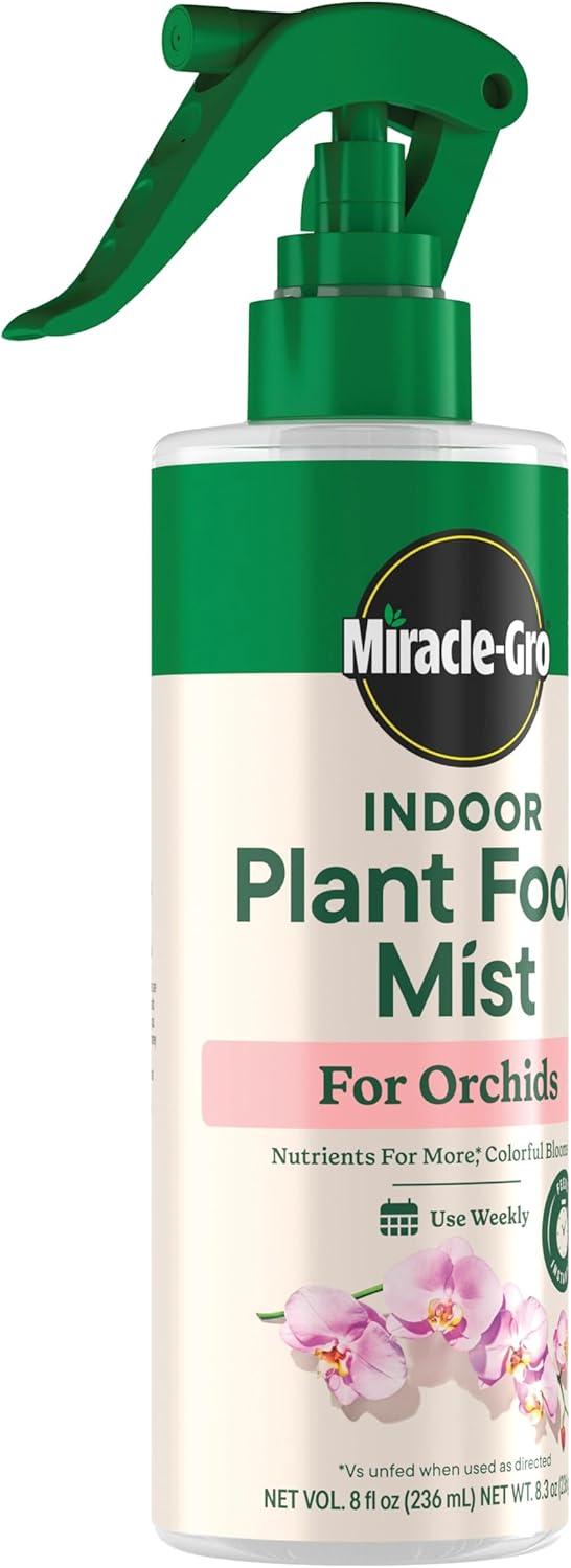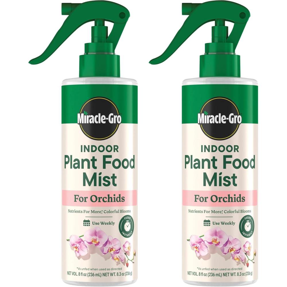 Care for your indoor orchids with Miracle-Gro® Indoor Plant Food Mist for Orchids. This easy-to-use plant food mist contains nutrients for colorful orchid flowers and more* orchid blooms, and uses a specialized mister to mimic the natural feeding conditions for healthy orchids. Use this plant food spray to nurture indoor orchid plants, including Phalaenopsis (Moth Orchid), Cattleya, Cymbidium (Boat Orchid), Dendrobium, Dendrobium Nobile, Miltonia, Oncidium (Dancing Lady Orchid) and Paphiopedilum. With this ready-to-use orchid plant food, you're just a few quick spritzes away from providing your orchids with an instant boost of nutrition. There's no mixing or measuring required – simply spray your orchid's leaves, roots, and the top of the soil with plant food mist, taking care to avoid flowers. Reapply once every week. This bundle comes with two 8 fl. oz. bottles of Miracle-Gro® Indoor Plant Food Mist for Orchids; for more spectacular results, use with Miracle-Gro® Indoor Potting Mix for Orchids, sold separately. *vs unfed when used as directed