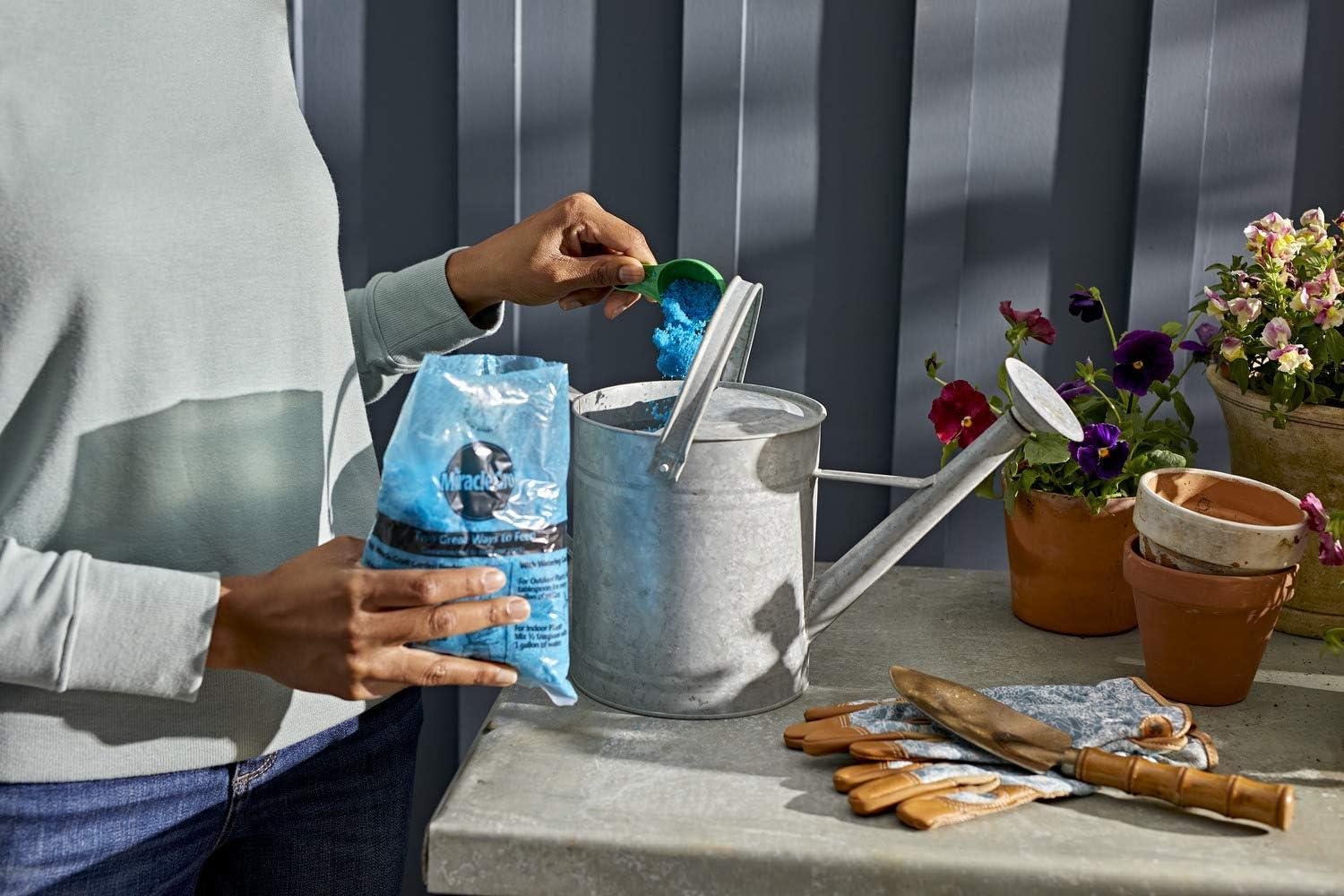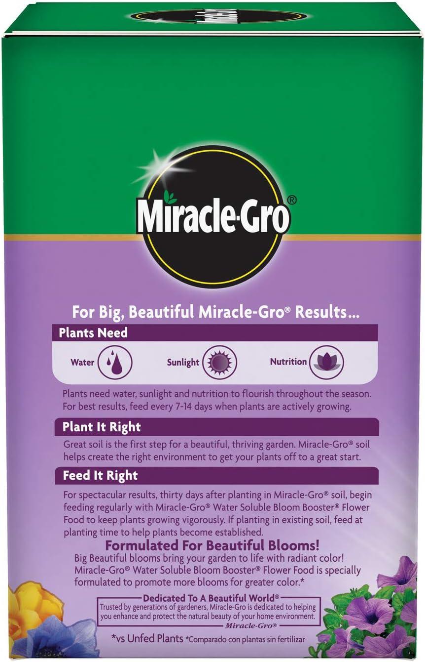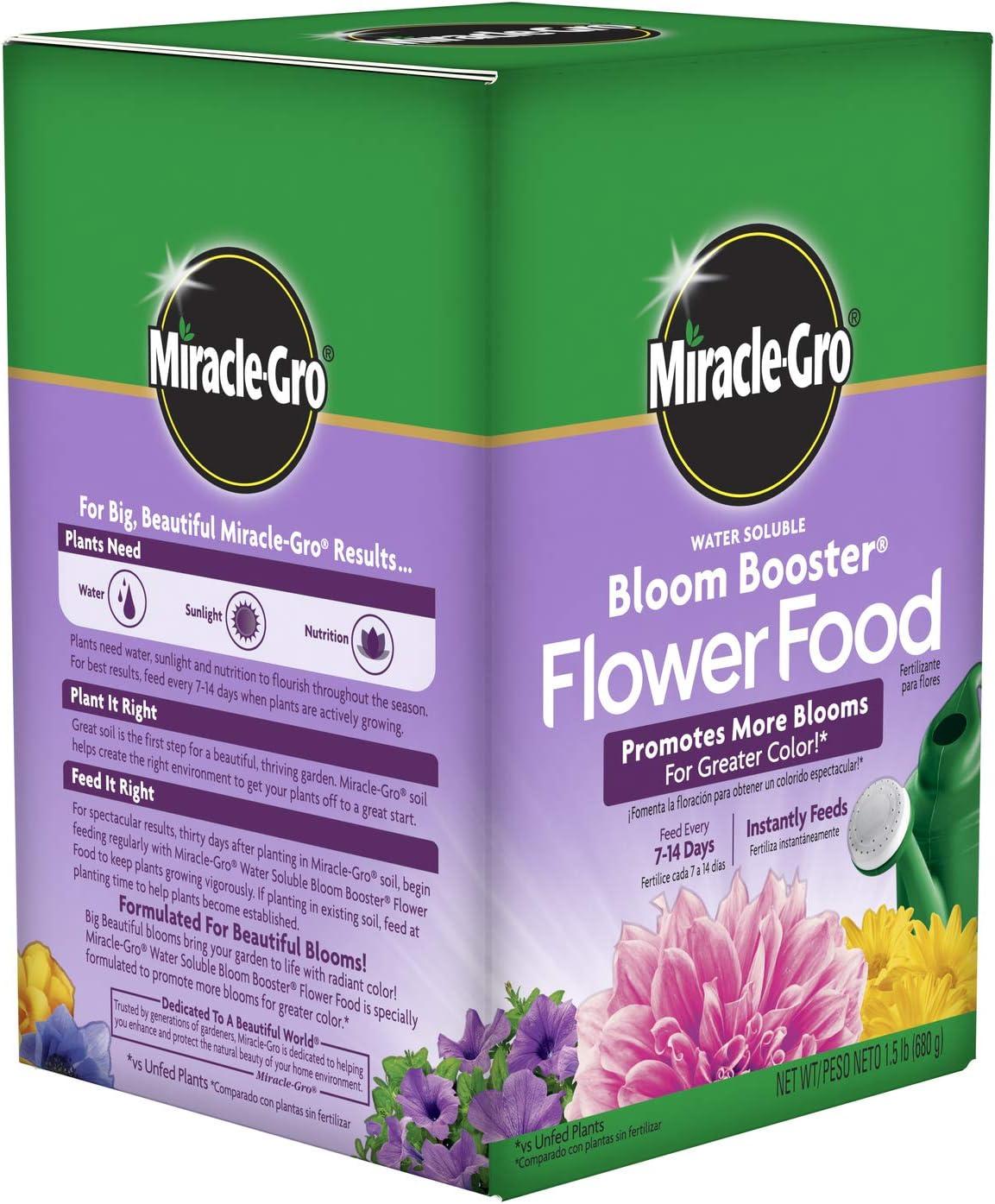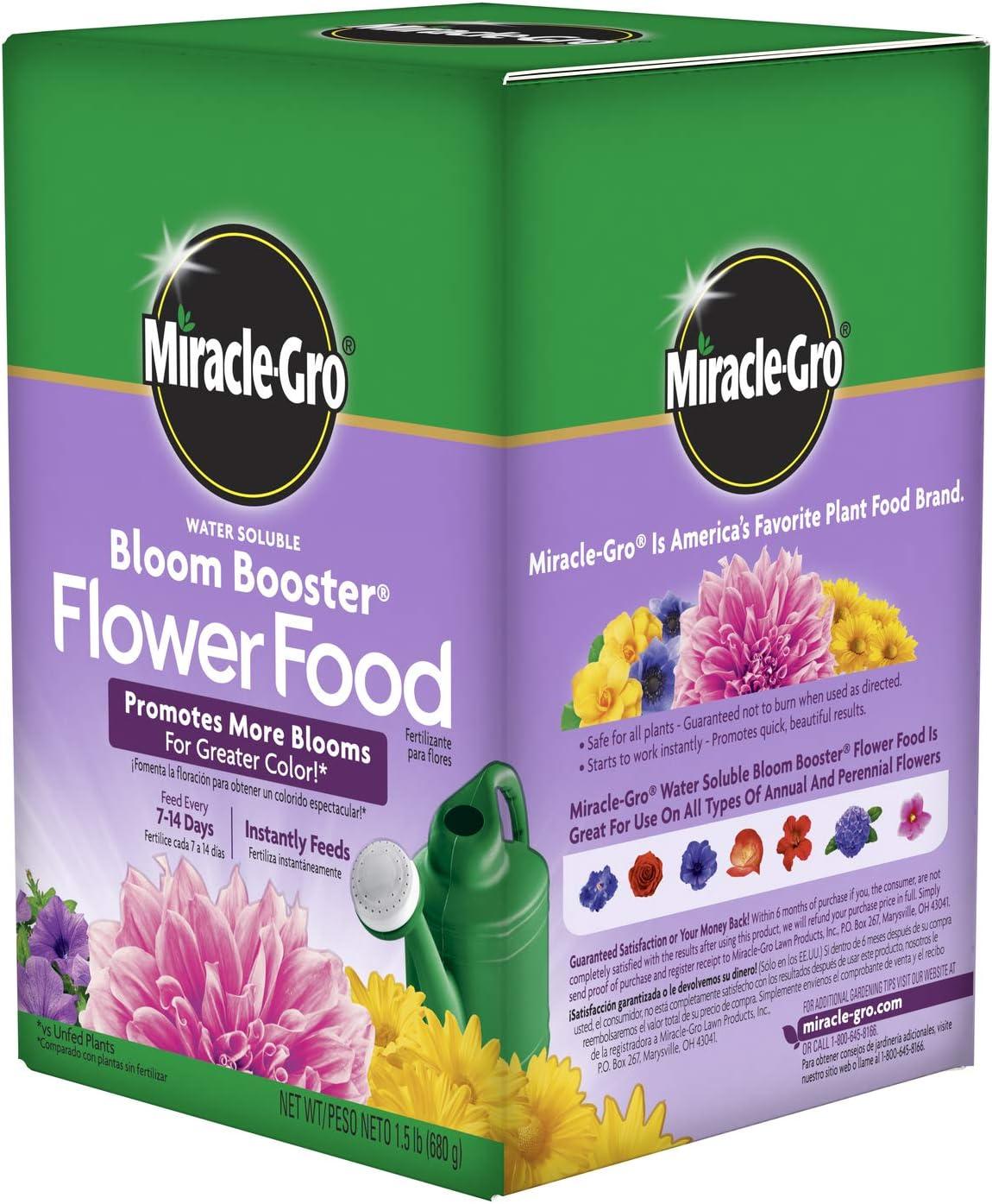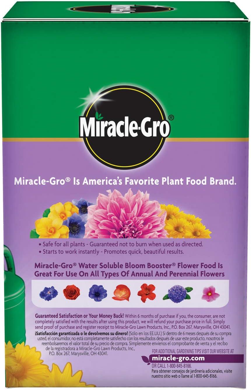 Grow a garden of stunning blooms with Miracle-Gro® Water Soluble Bloom Booster® Flower Food. This plant food promotes more blooms for greater color!* Mix with water to feed flowering plants instantly. Use this flower food with container and in-ground plants, including annual and perennial flowers, roses, hydrangeas, daisies, hibiscus, azaleas, petunias, dahlias, begonias, and camelias. For indoor plants, mix 1/2 teaspoon (small end of the included scoop) per gallon of water in a watering can and apply every 2 weeks. Outdoor plants require 1 1/2 teaspoons per 1 1/2 gallons of water. For larger outdoor gardens, fill a Miracle-Gro® Garden Feeder jar to the top and follow the instructions on the feeder label. Soak the soil at the base of each plant to fertilize the roots every 7 to 14 days. One 5.5 lb. container of Miracle-Gro® Water Soluble Bloom Booster® Flower Food covers up to 2,200 sq. ft. of garden area. *vs unfed plants